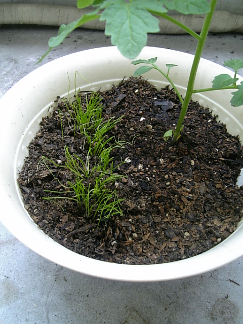 写真の太い茎のほうは、ミニトマトです。ちょっと大きくなったような気もしますが、まだまだ花は咲かなそう。
